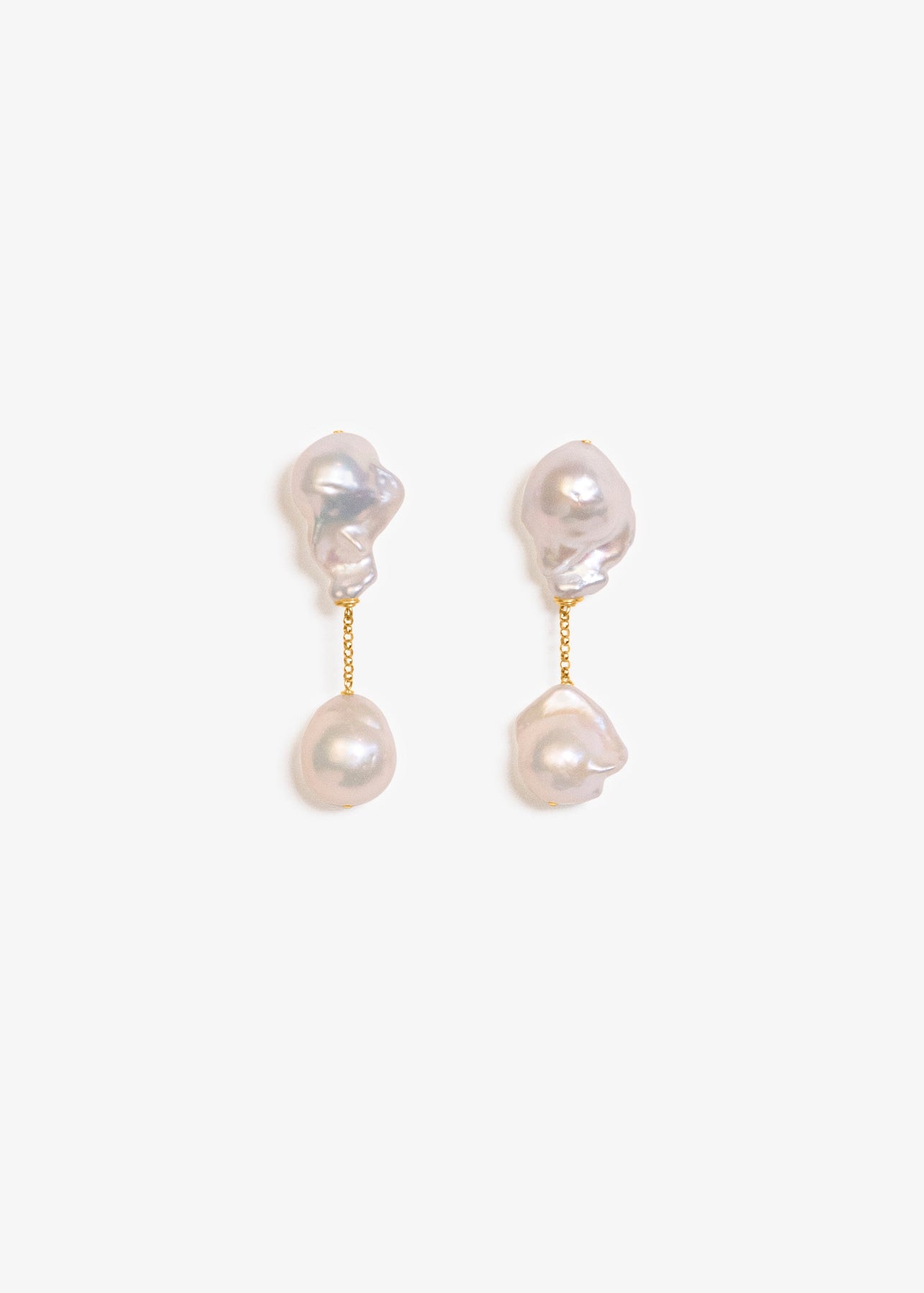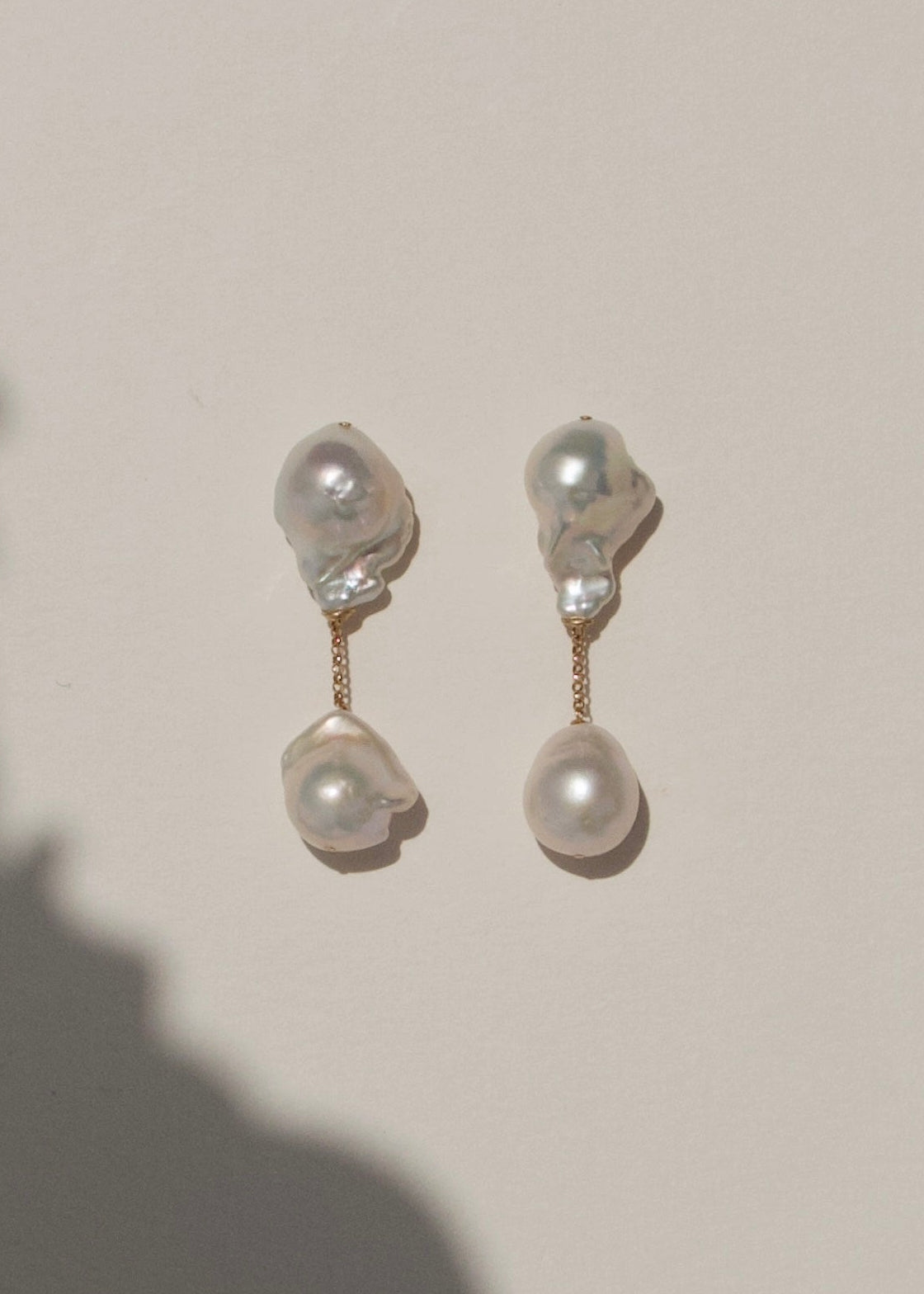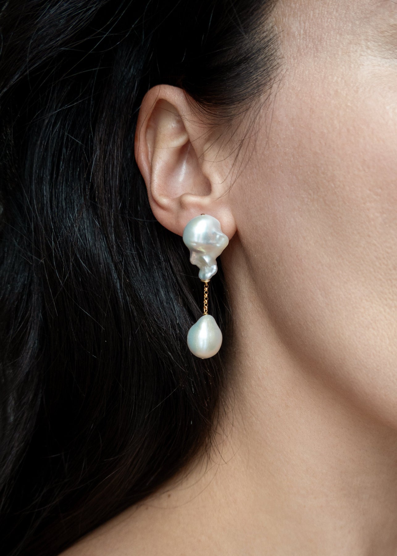 Four baroque pearls come together in a striking vertical composition, with sculptural forms at the top and rounder silhouettes anchoring the base. Connected by a solid 14k gold rollo chain, the design feels structured yet fluid. Petite in scale but substantial in presence, Anya delivers quiet impact with refined strength.