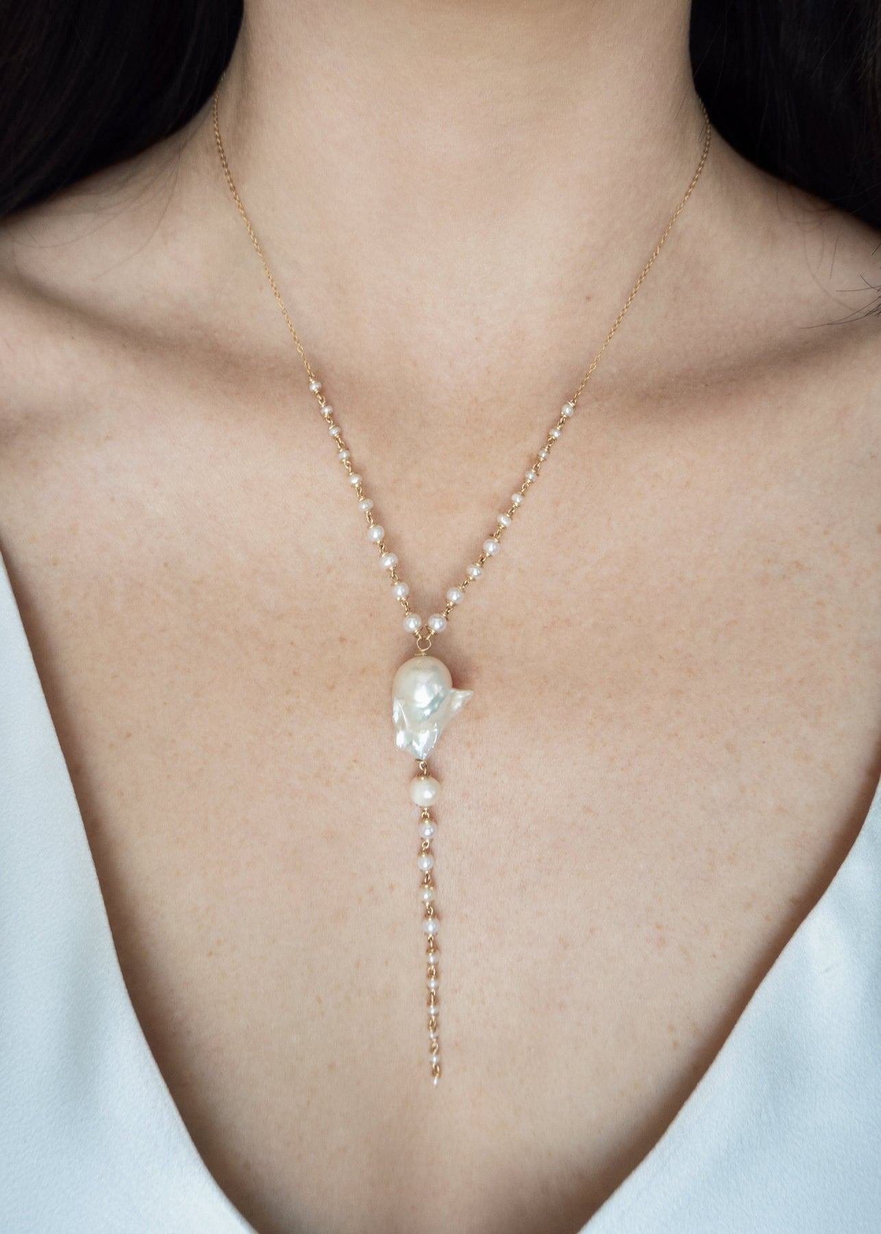 A luminous baroque pearl anchors the center, framed by three strands of seed pearls that taper gently in size. They meet a delicate chain that adds just the right amount of shine. Perfect for a deep neckline or a modern bridal look, it’s refined, feminine, and quietly striking.