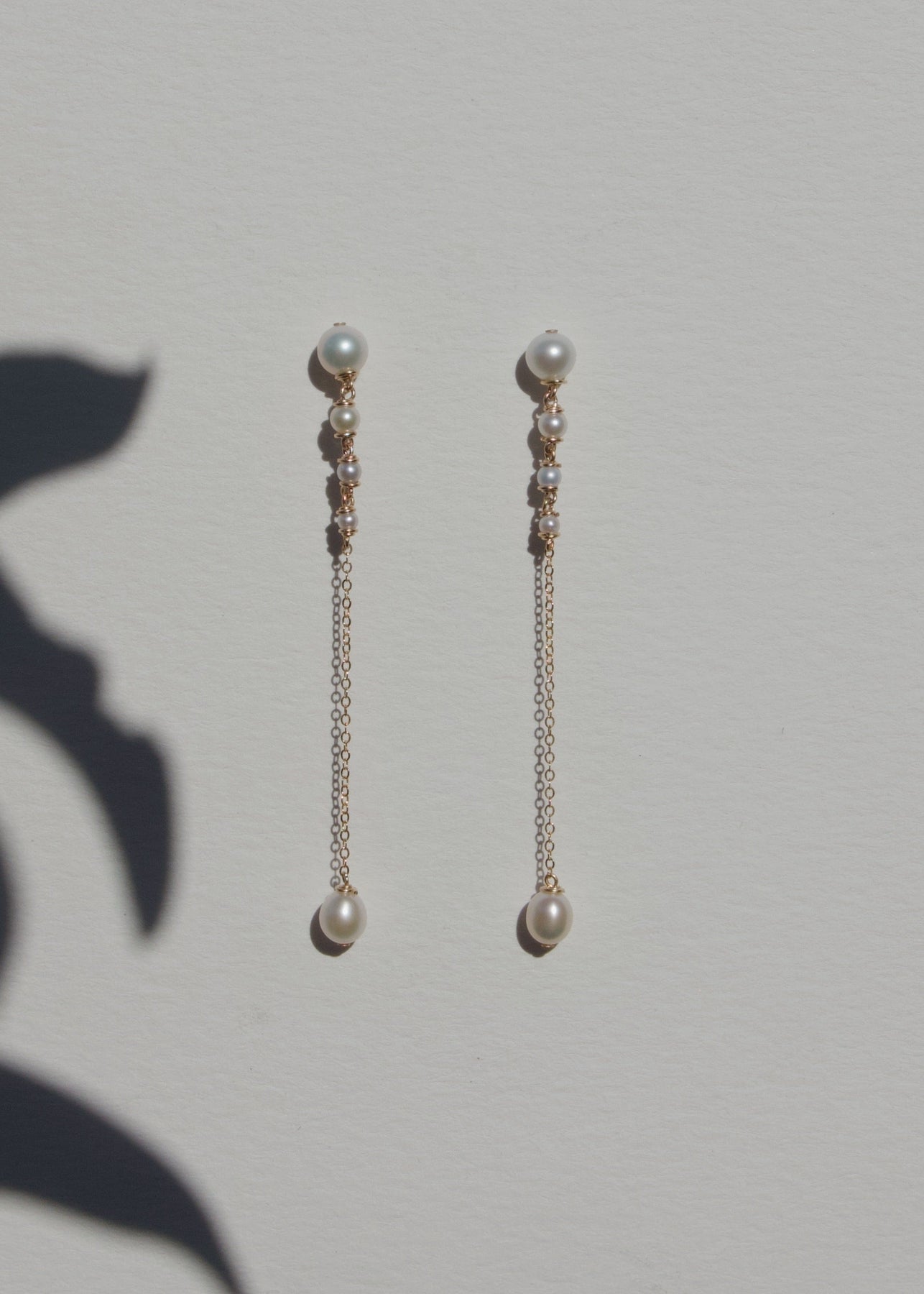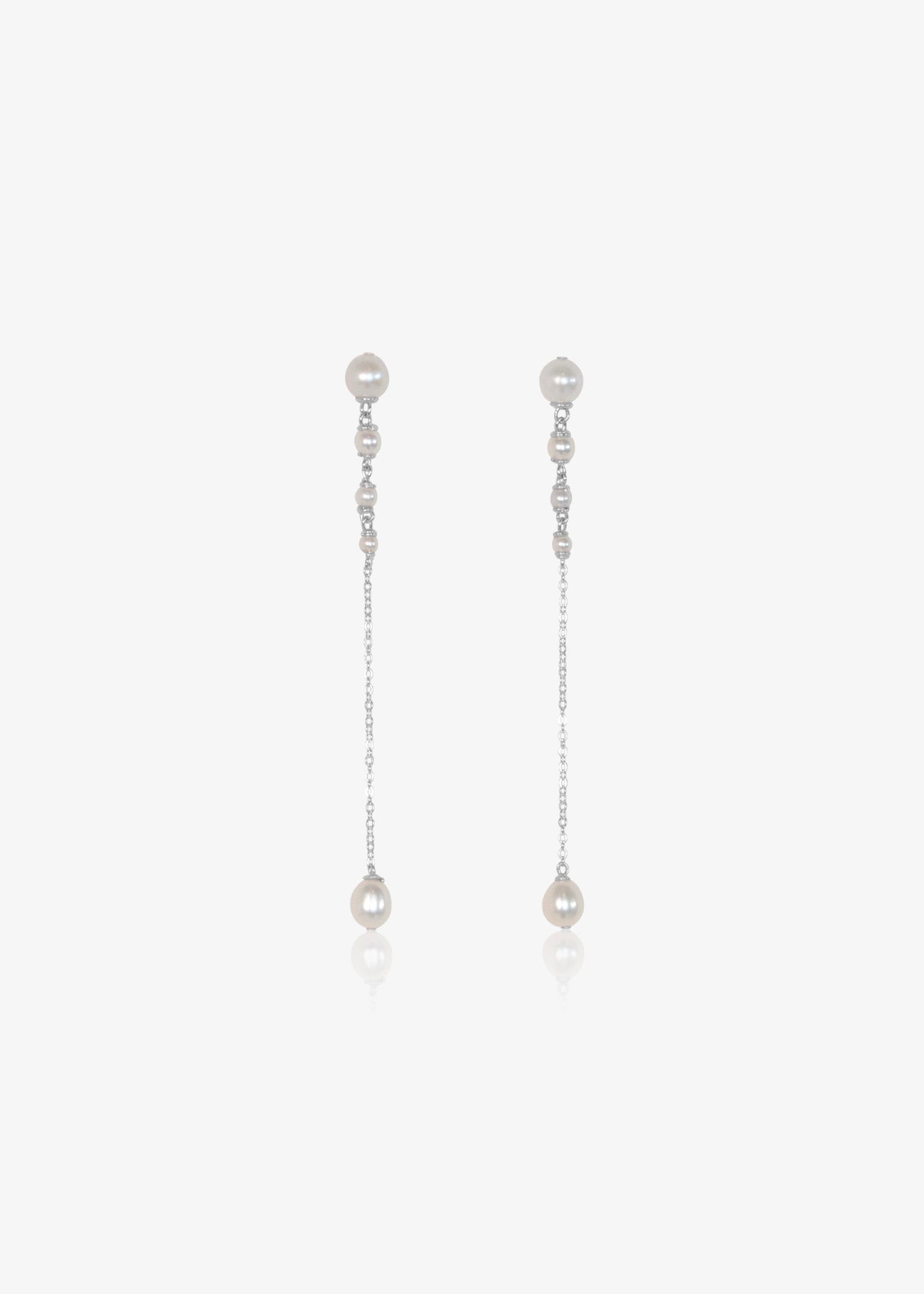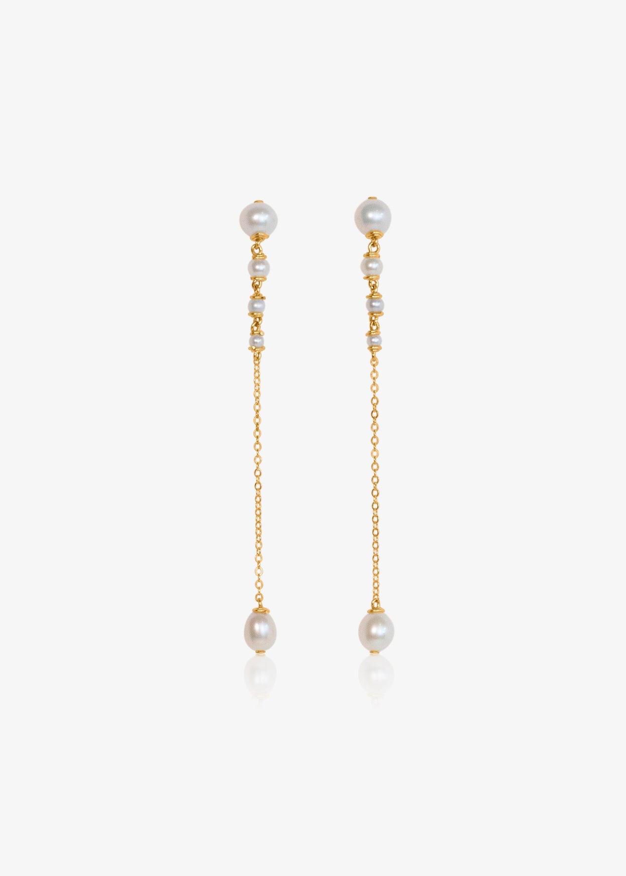Three inches of effortless elegance. These earrings feature pearls that flow from larger to smaller, ending in a single teardrop pearl. Suspended from a reflective chain, the Lucine Earrings pair beautifully with the Lucine Necklace for a refined, standout look.