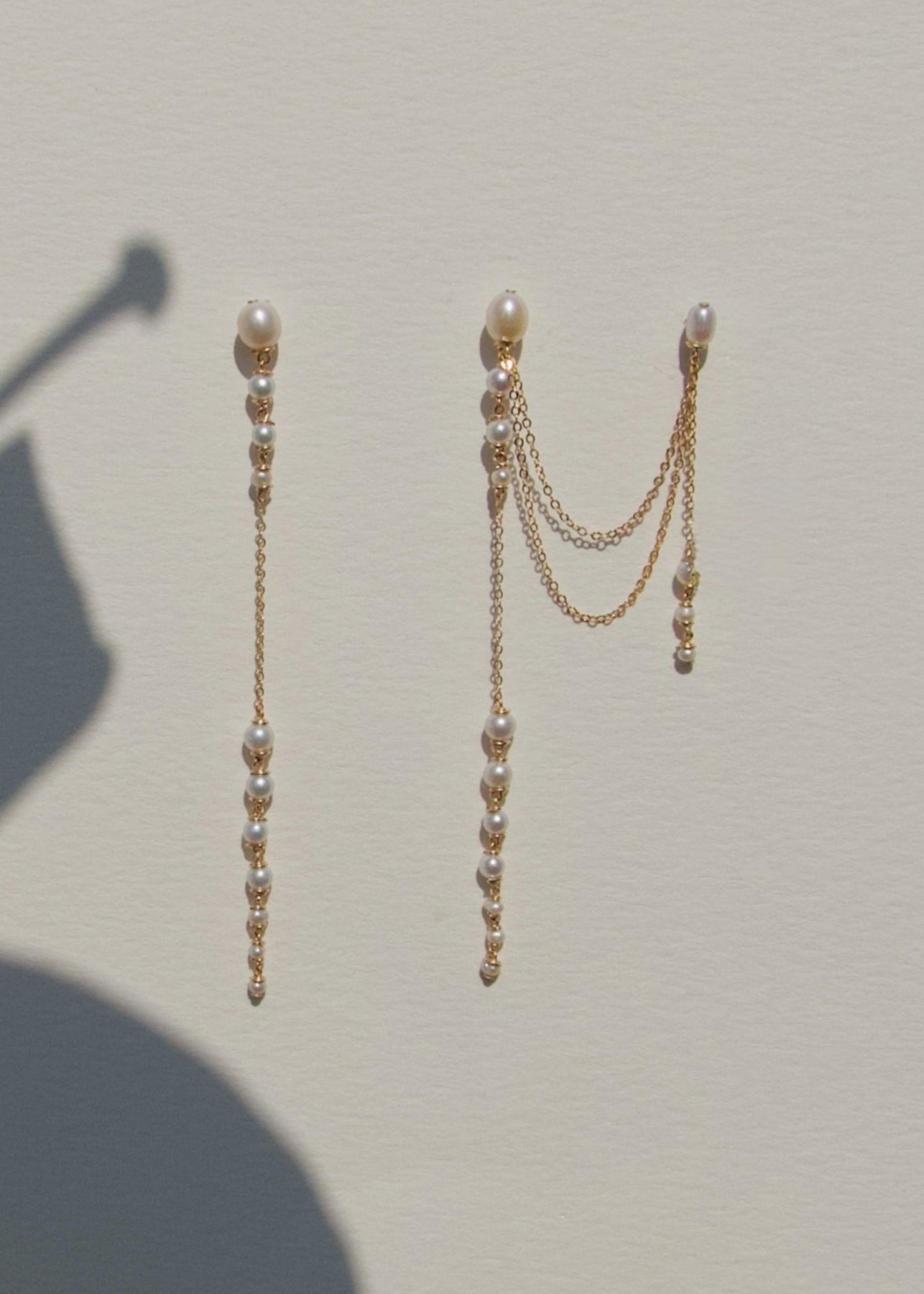 Dahlia - A gentle cascade of seed pearls creates a tapering effect that feels almost weightless. Designed to drape across two piercings the silhouette is delicate, but far from simple. Each pearl moves with quiet intention, catching the light like raindro