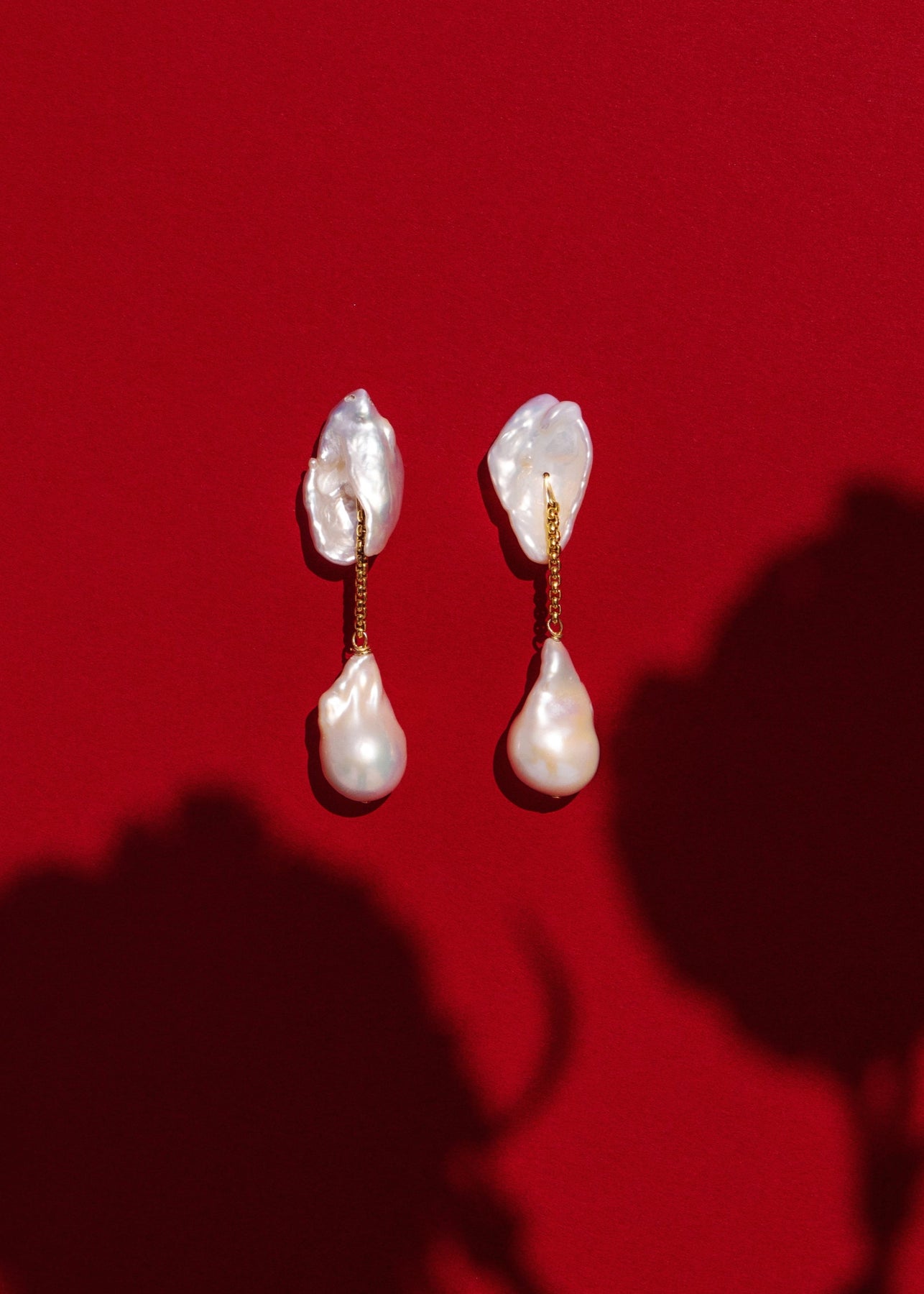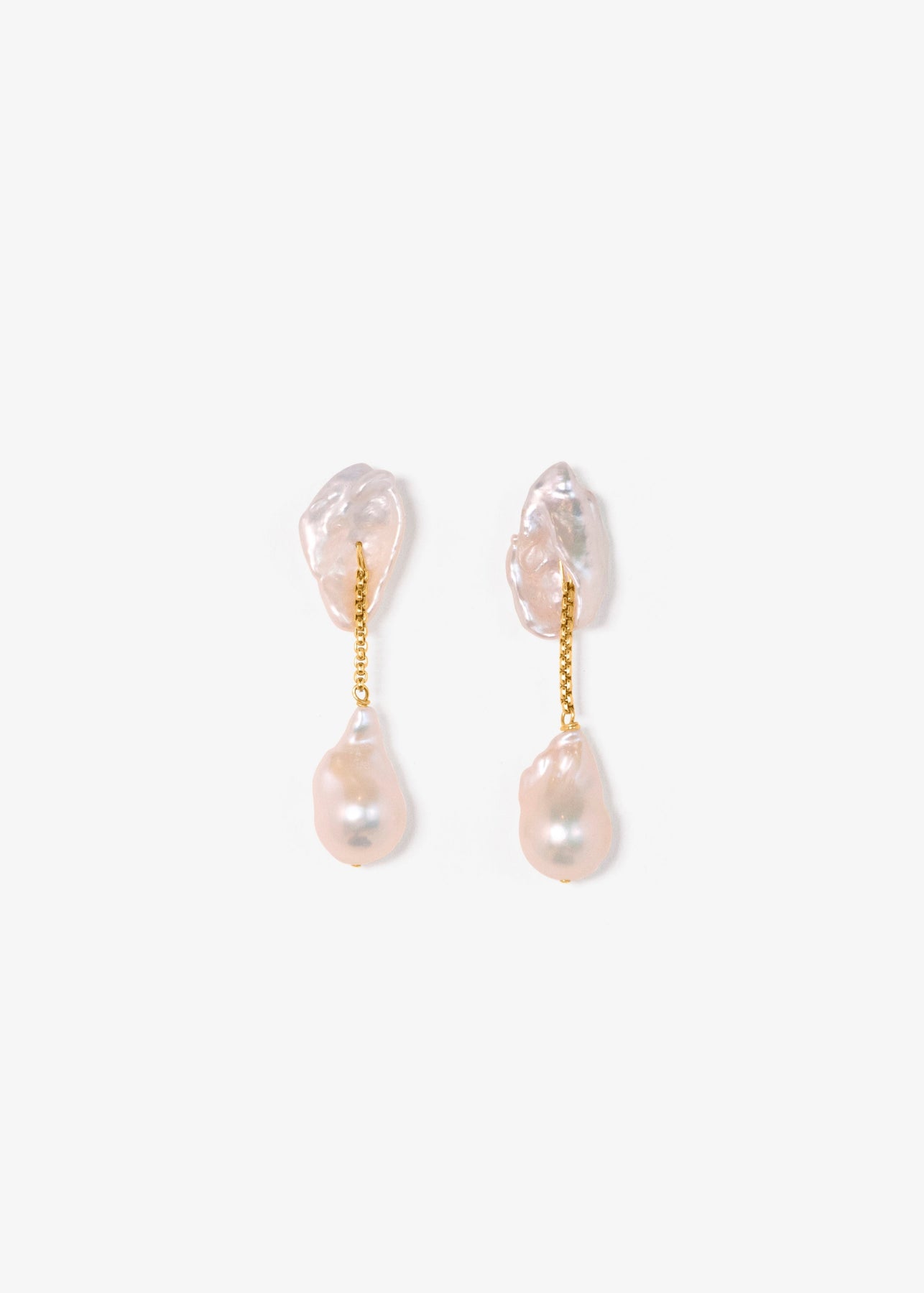 Dessa - These earrings feature two large keshi pearls shaped like conch shells, offering a unique and textured focal point. Suspended from a sleek round box chain, a large baroque pearl hangs at the end, creating a stunning contrast of organic shapes and
