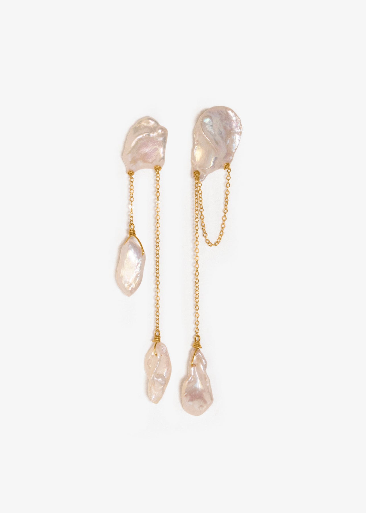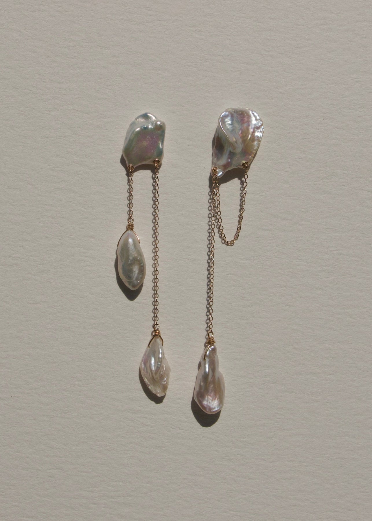 Perla - The keshi pearls in these earrings have sharp, angular shapes, resembling icy mountain peaks with captivating depth. Suspended from a bold, chunky cable chain, the design conveys both strength and elegance, creating a striking yet feminine silhoue