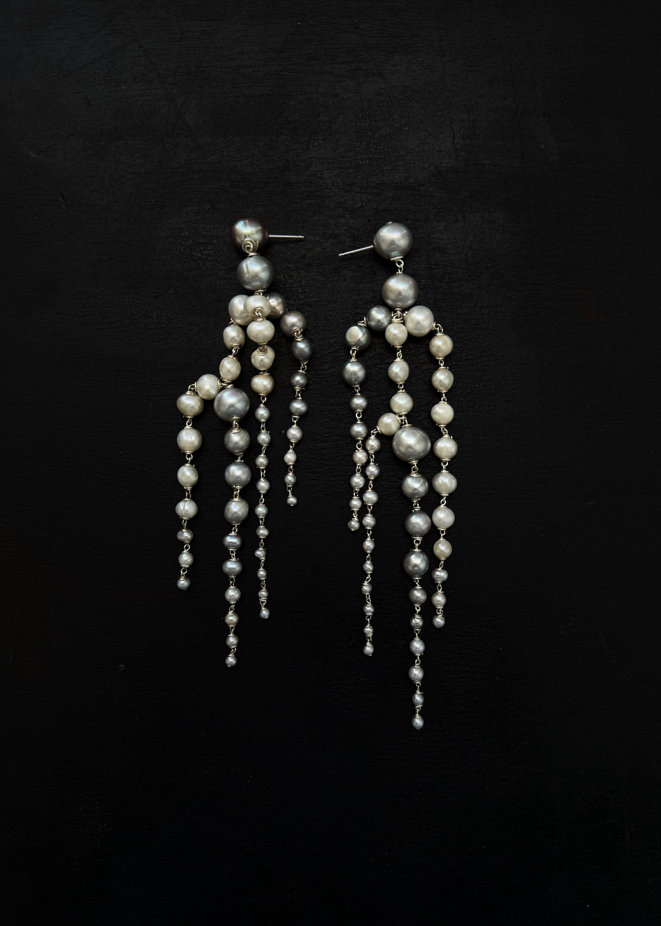 Crafted with silver pearls that gracefully taper into white seed pearls, these earrings are unlike any you’ve seen before. Striking yet soft, they sway with movement, adding an elegant touch to every look. The perfect statement piece to elevate any outfit.