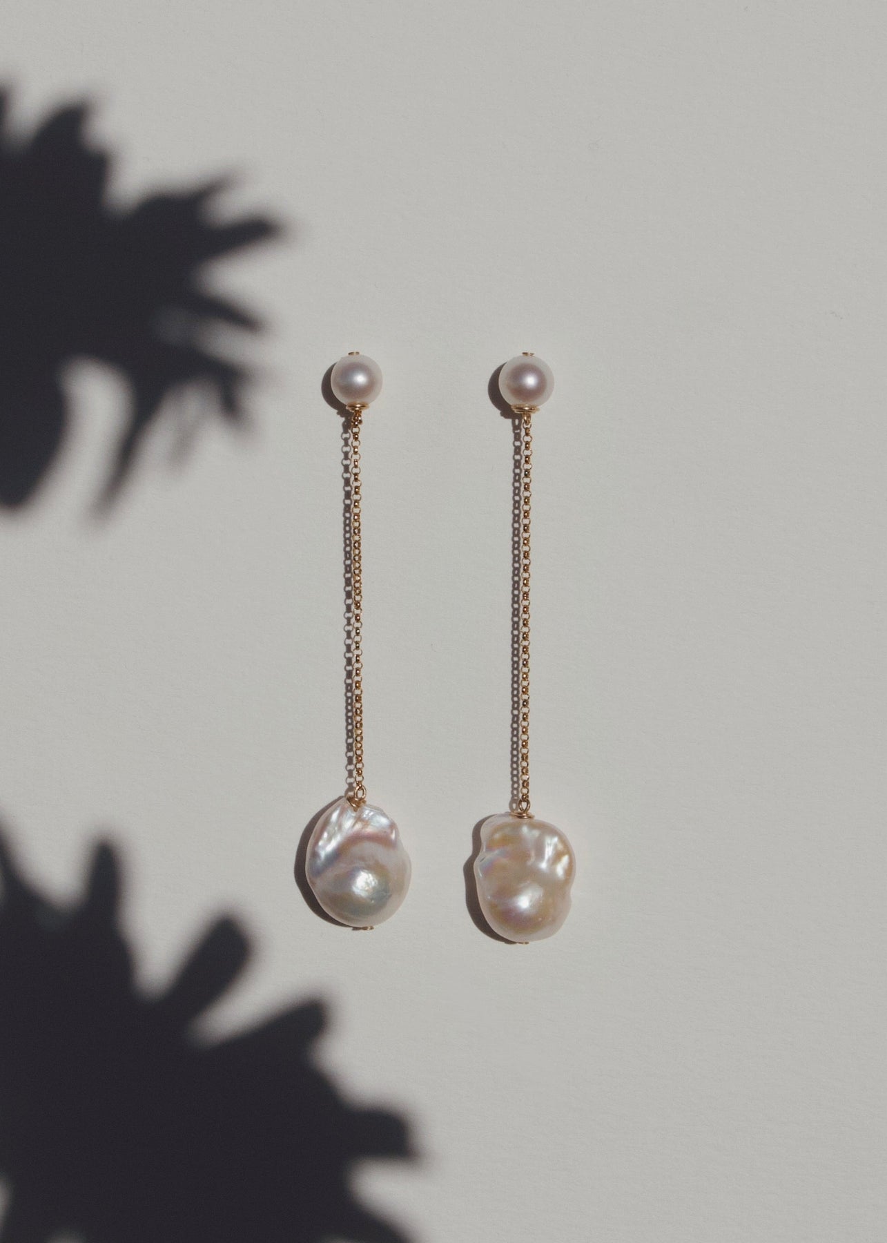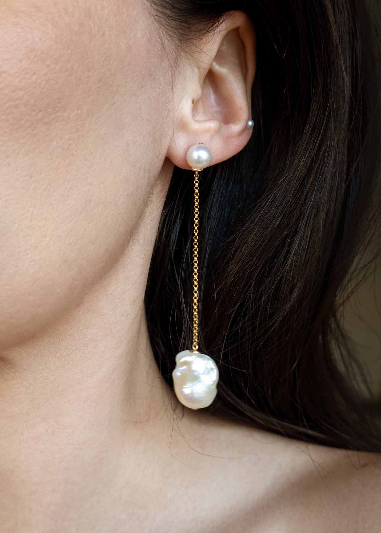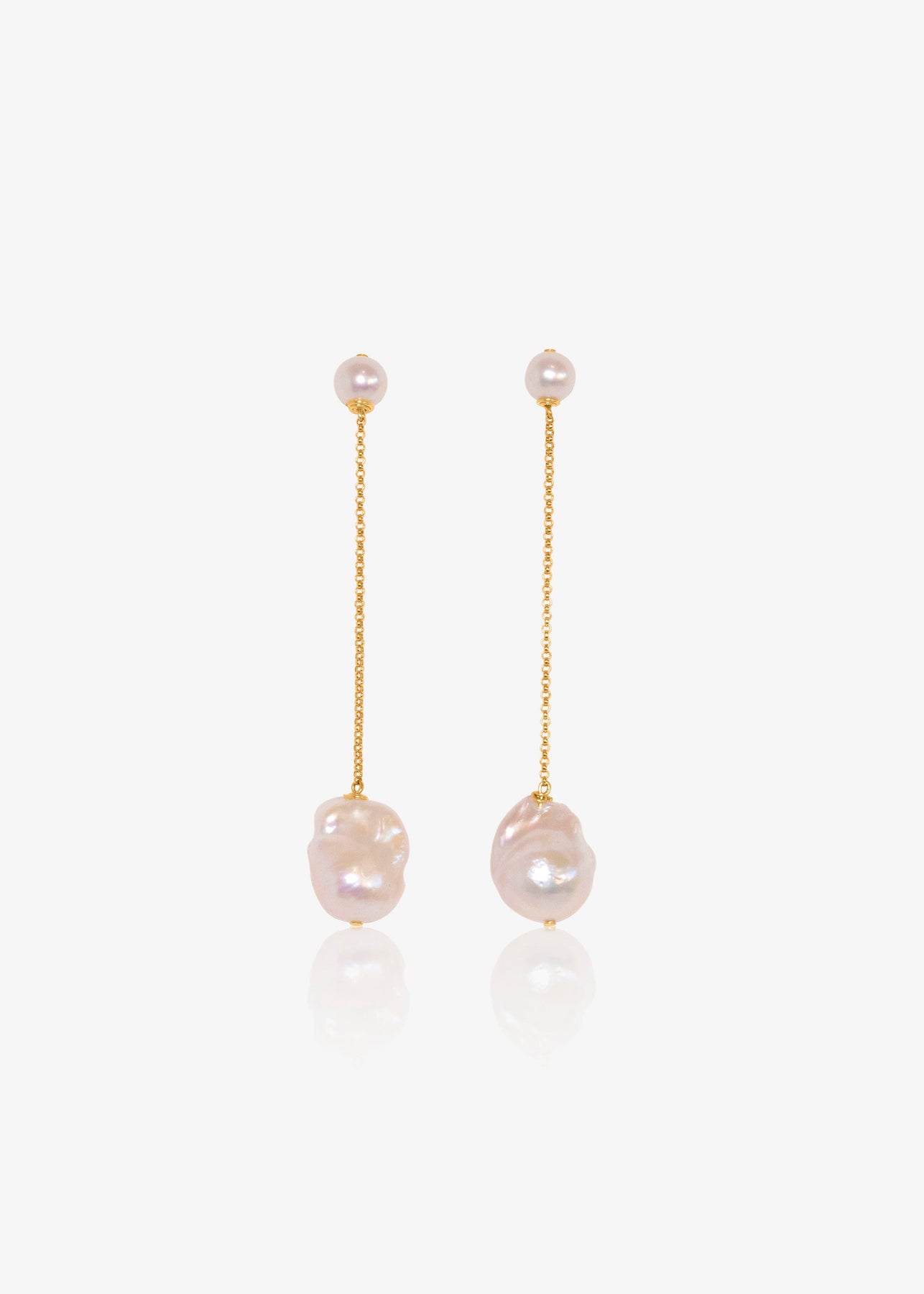 A luminous baroque pearl with a substantial yet delicate rollo chain, anchored by two button pearls at the top. A bolder interpretation of the classic pearl drop. Designed to feel just as right with everyday looks as they do for more dressed-up moments.