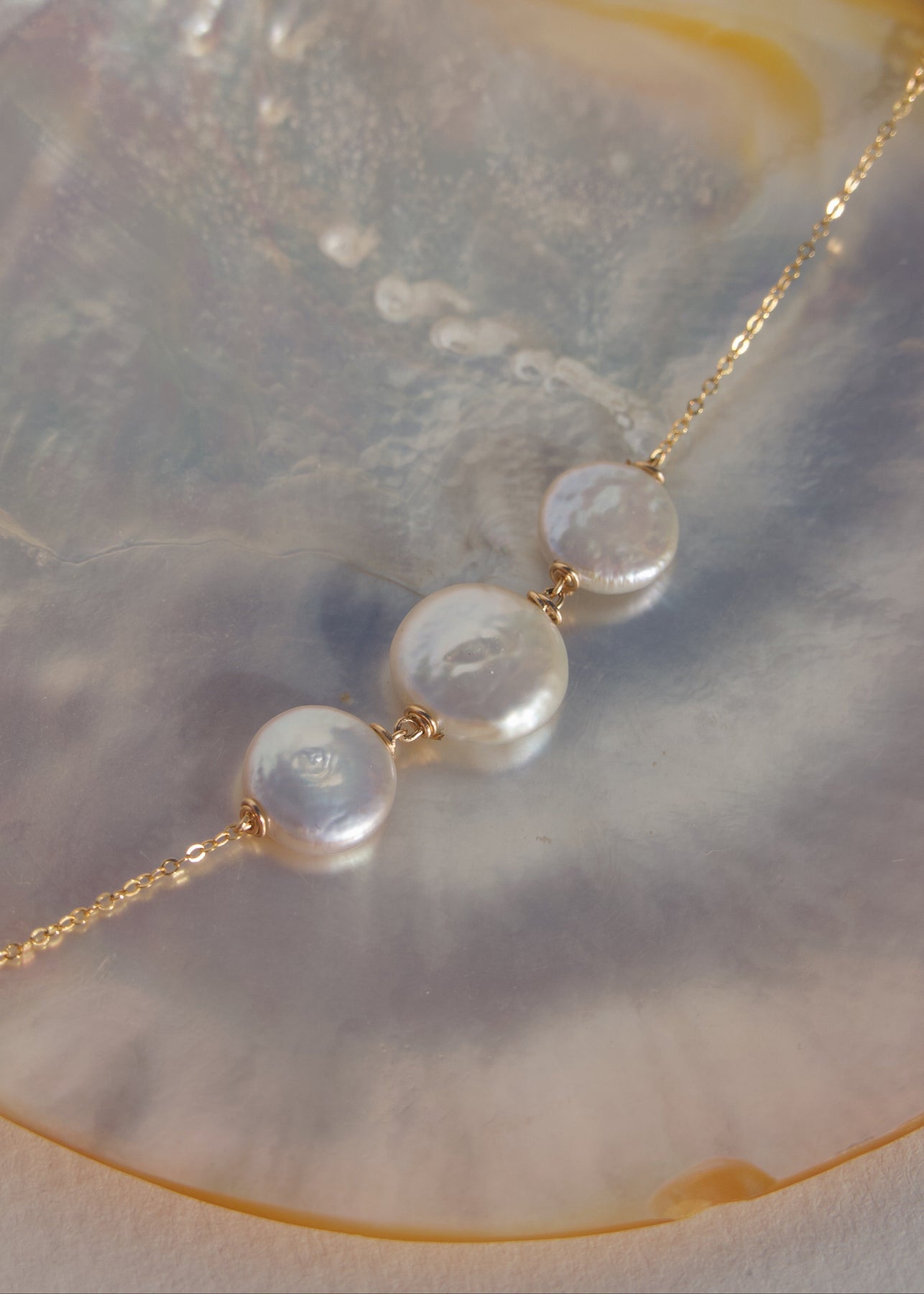 Three luminous coin pearls, one large at the center and two smaller pearls sit on its side. The Roselle’s clean, sculptural design makes it effortlessly chic for any occasion.