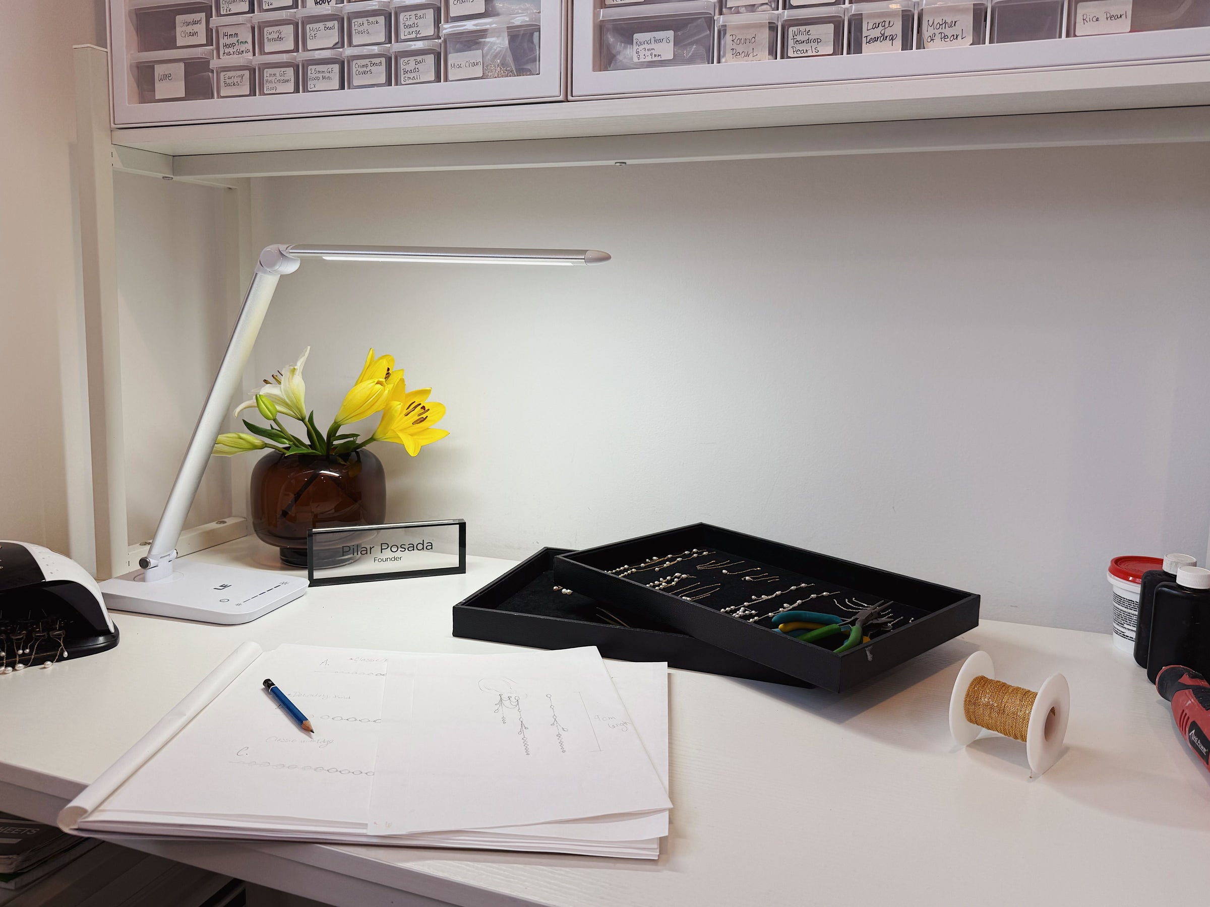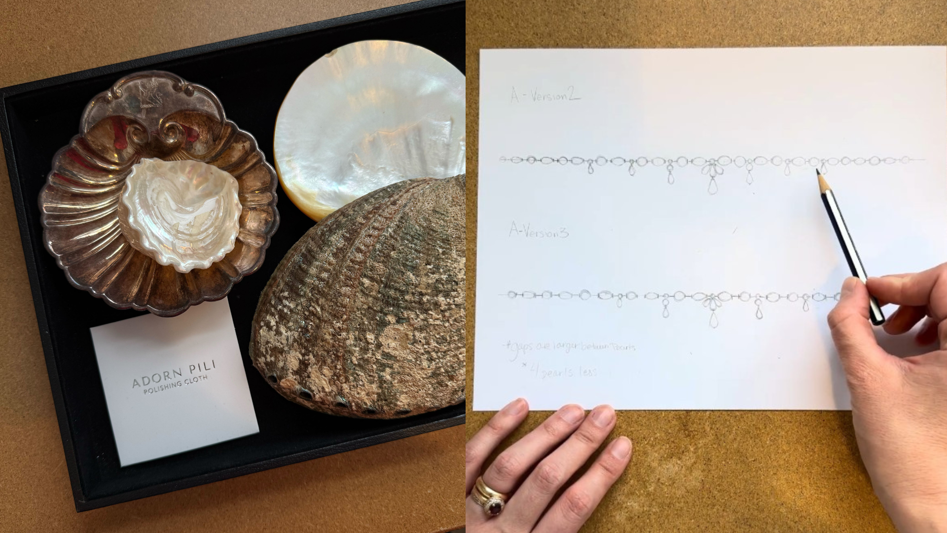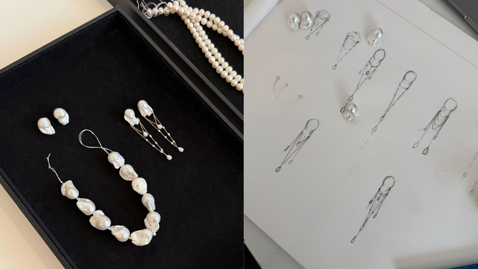 From there, Pilar refines the concept, studying proportion, movement, and balance. Pearls are selected by hand in our studio, chosen for their individuality and organic character. Their form guides the composition.
